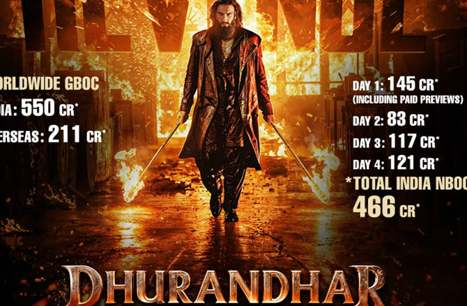 رنویر سنگھ کی فلم ’’ دُھرندھر ۲‘‘نے پانچویں دن تک ہندوستان میں۴۵۴؍ کروڑ روپے سے زیادہ کی کمائی کر لی ہے۔ پیر کے دن عام طور پر کمی دیکھنے میں آتی ہے، اور اس فلم کے ساتھ بھی ایسا ہی ہوا، لیکن مضبوط اوپننگ ویک اینڈ کے بعد فلم اب بھی مستحکم کارکردگی دکھا رہی ہے۔